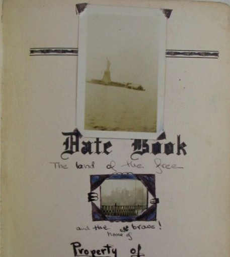 Travel Diary of a Young Woman’s trip to Europe, 1929-1930. No publisher or place, circa 1929 to 1930. Written in a limp leatherbound date book. Name withheld for privacy. Approximately 200 pages of entries, each corresponding with a single day of events. The woman’s trip began in Boston on September 28, 1929, and ended back in Boston on April 14, 1930. Rear endpaper decorated with an illustration of a church and a Cunard Line ship, with the HMS Carmania depicted. Front of the book has a few small photos of New York, and an inscription from the author to a friend. The author chronicles her time aboard the Carmania, her time in Paris, Nice, St. Moritz, Rome, London and other places. She mentions her father calling on General Pershing in Paris, gambling in Monte Carlo, playing tennis in Nice, skiing and skating in St. Moritz, meeting many young gentlemen, etc. Of historical note, the HMS Carmania launched as a passenger ship in 1905, and served in World War I, participating in the sinking of a German ship. It continued operating until 1931. We note that no mention of the Wall Street market crash and Black Thursday is mentioned in the journal: the author seems to have been enjoying breakfast chocalat in Paris during that stretch. The writing is well done, somewhat personal, but mostly documents the daily activities of a young woman traveling in Europe. GOOD+ condition. Minor fading, scuffing and edgewear to the covers. $150.00