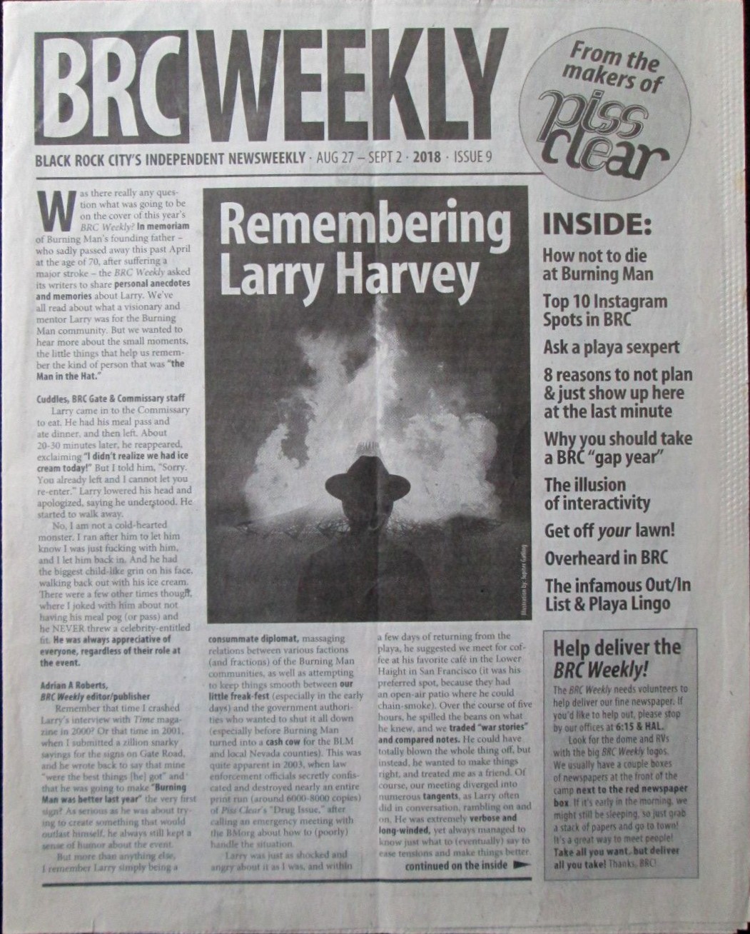 [Burning Man] Various Authors. BRC Weekly. Black Rock City’s Independent Newsweekly. August 27-Sept 2., 2018. BRC Weekly, Adrian Roberts, Publisher. Black Rock City, NV: 2018. Single newsprint sheet, folded into eight pages. With a few black and white photos. A newsletter issued for those attending the Burning Man festival. This issue with helpful hints on how not to die at Burning Man; Top 10 Instagram spots in BRC (because if it’s not on Instagram there’s no f**kin’ way you were there, or anywhere. Do you even exist bro?) and other helpful tips. Burning Man started in the late 1980s on a California beach, eventually growing into the large festival it has become. And just think, for about one tenth of the current base level ticket price of this festival of decommodification, you can own someone else’s memory of it! VERY GOOD+ condition. Minor toning and wrinkling. $55.00 nyl