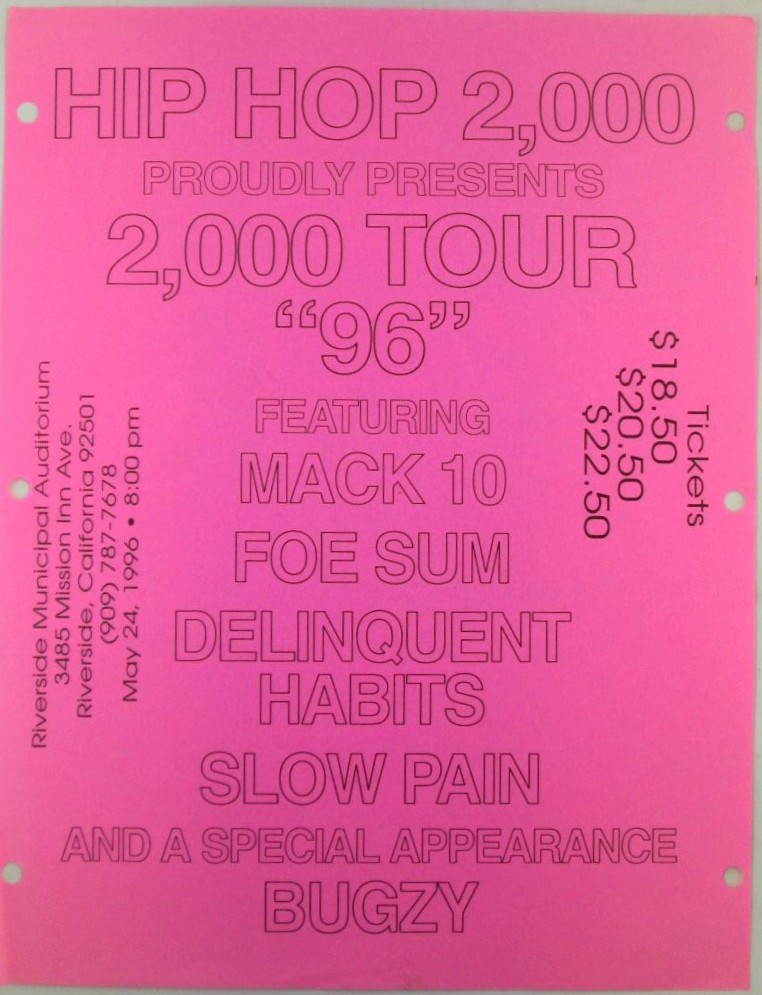 [Hip Hop] Hip Hop 2,000 Proudly Presents 2,000 Tour “96” Featuring Mack 10, Foesum, Delinquent Habits, Slow Pain and a Special Appearance Bugzy Concert Flyer. Hip Hop 2,000, presumed publisher. Riverside, CA: 1996. Single sheet, 8 ½ by 11 inches. Pink paper stock. Printed lettering. A flyer for a concert that was supposed to be held on May 24, 1996 at the Riverside Municipal Auditorium in Riverside, California. It appears to have been a line up of primarily hip hop artists from Southern California, including Mack 10 (apparently solo and not part of Westside Connection), Foesum, Delinquent Habits, Slow Pain and Bugzy. Quite a good line up of hip hop artists, in our humble opinion. Our research did not turn up a concert for this date for any of these performers, nor a concert at the Riverside on that date. A hip hop mystery! GOOD condition. Three hole punches along each side edge. Minor wrinkling and creasing. $150.00