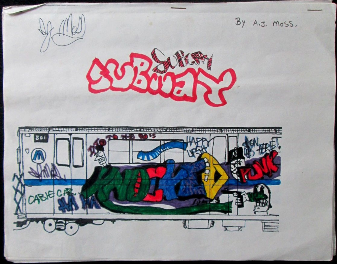 [Graffiti, Vernacular Art]. Moss, A.J. (artist). Subway. Book of hand drawn/colored Graffiti Art. A.J. Moss, Publisher. No place or date, presumed early 1990s. 8 leaves, 8 ½ by 11 inches. Side stapled. Printed on single sides only. A self-published collection of color drawings depicting a subway train car marked up with graffiti. The artist, A.J. Moss, uses what appears to be a hand drawn, but reproduced, template of a subway car, with each leaf containing different graffiti art and tags. Hand colored in marker. We could not find any indication as to who A.J. Moss is. GOOD condition. Some curling, creasing and wrinkling along the edges. Minor soiling. Minor ink bleed through on some of the pages. $75.00