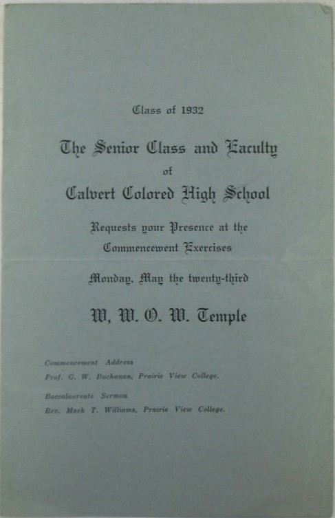 Calvert Colored High School Commencement Exercises Program. Class of 1932. The Senior Class and Faculty of Calvert Colored High School. Calvert Colored High School, Publisher. Calvert, TX: 1932. Single sheet, folded into four pages, 8 ½ by 5 ½ inches. Cover mentions day and location of the commencement, May 23rd at the W,W.O.W. Temple. Interior lists the names of the senior class students, as well as class officers, Board of Education members and faculty members. The Calvert Colored High School was built in 1929, with aid from the Rosenwald School Fund. It was originally named Calvert County Training School. This school was a step toward providing real education to Black students in the area, as most of the students at that time attended “plantation” schools until they were old enough to work in the fields. The school offered vocational training, although apparently focusing on skills that would not conflict with occupations commonly held by white people (Texas State Historical Landmark text). The school changed its name to the W.D. Spigner High School in 1961, named after its long time headmaster. GOOD condition. Appears to have been removed from a scrapbook or photobook, as there are large areas of black paper adhered to the blank rear page. Horizontal fold crease present. Minor toning, wrinkling and creasing. $125.00