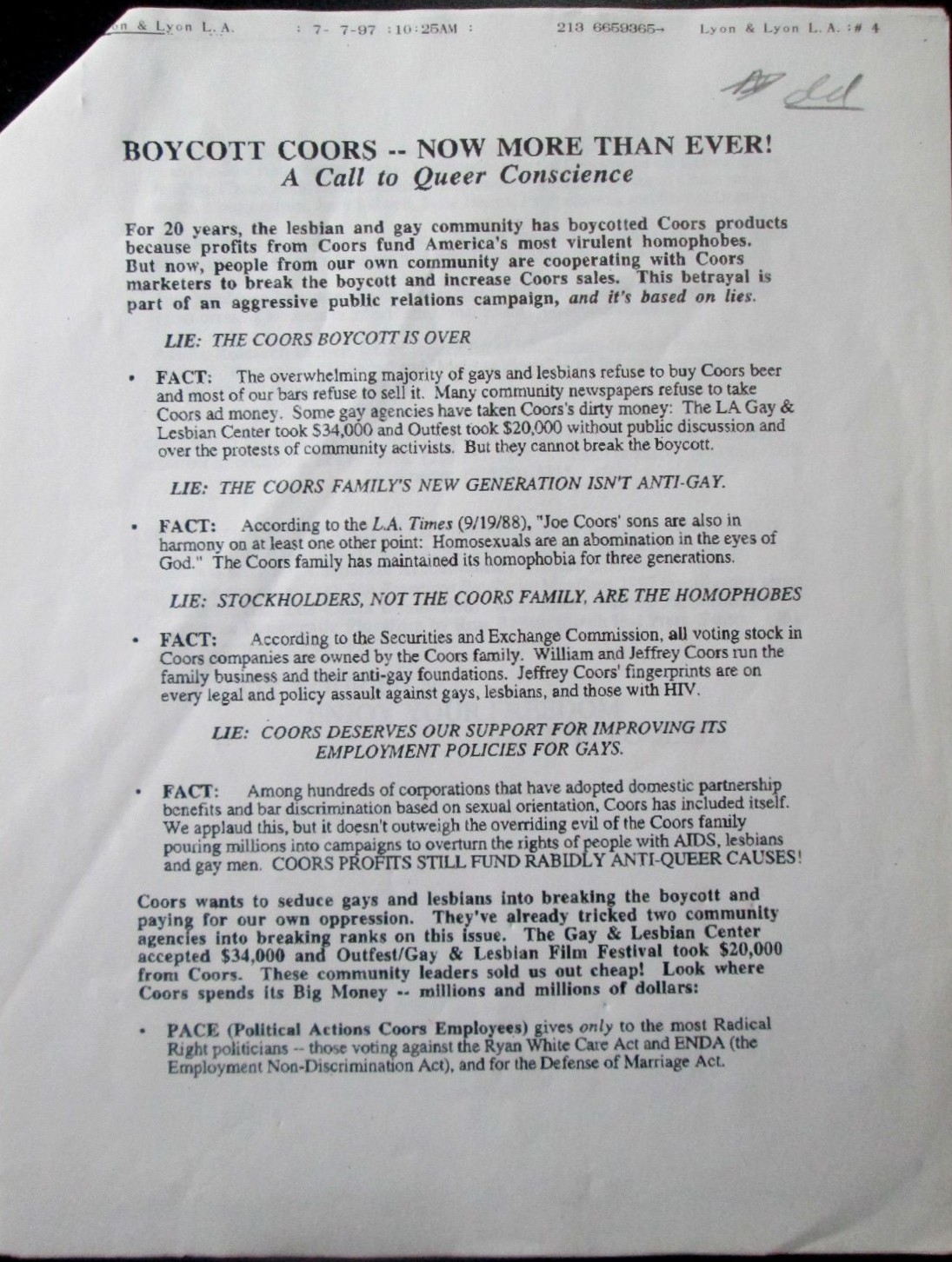 [LGBTQ+] Boycott Coors!—Now More than Ever! Call to Queer Conscience. Informational Packet. Lyon and Lyon, Publisher. (Los Angeles, 1997). 4 sheets, 8 ½ by 11 inches, stapled at the upper left corner. Printed on singles sides only. Appears to be missing the first page. A packet perhaps prepared as a press release, providing facts to the LGBTQ+ community regarding the Coors Brewing Company and its funding of conservative and radical right groups that work against the LGBTQ+ community. The first two leaves reproduce an article from the San Francisco Bay Times that discusses the ongoing boycott and attempts by Coors to end it. The last two leaves addresses those within the LGBTO+ community who are working with Coors marketing or accepting funding from Coors, outlining where Coors donates and spends its money. The leaflet cites The Gay and Lesbian Center and the Outfest/Gay and Lesbian Film Festival as two groups who took funding from Coors. The Boycott originated in the 1960s among labor organizations, and grew to include African American and Hispanic groups, as well as the LGBTQ+ community. According to some, these decades long boycotts cost Coors millions in profits, and kept the company expansion slowed. VERY GOOD condition. Minor wrinkling. Pencil note on the 4th page. $55.00