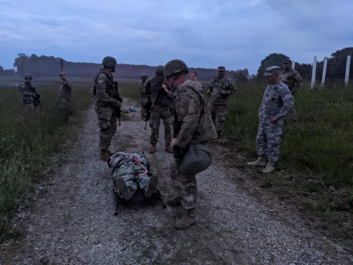 The 61st Medical Company (TNSG) supported the Tennessee National Guard’s 230th Signal Company on May 15, 2021 at their Tine-E Army Warrior Task Training and Capstone event conducted at Milan VTS. Sgt. 1st Class Brian Emigh and Capt. Dan Smiley trained 97 soldiers in selected Tactical Combat medical care and lifesaving medical skill drills in six rotations. The 61st also coordinated the medical component of the Capstone event that included small unit tactics with opposing forces and culminated in the rescue, medical care and transport of an downed pilot. The 61st also provided onsite medical care to sick or injured soldiers during the event. In recognition of their volunteer efforts, serving a 20-hour day plus preparation time, the Tennessee Army National Guard awarded Capt. Smiley and Sgt. 1st Class Emigh each an Individual Achievement Ribbon.