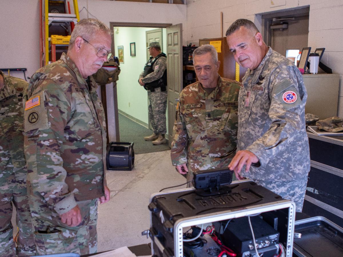 Leadership of the Georgia State Defense Force traveled to Nashville in early July to share knowledge and build relationships. The interstate trip by Commanding General Brig. Gen. Mark Gelhardt, Chief of Staff Col. Dirk Daube, and Command Sgt. Maj. Patrick O'Leary marked the first recent effort to ensure communication with neighboring states to be prepared for major incidents that may require a multi-state response. They met with TNSG Commanding General Juan Santiago, TNSG Command Sgt. Major Scott Caudill, Regimental Commanders and the leaders of units located at TNSG headquarters, and observed statewide communications training.