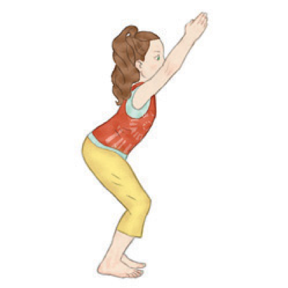 Stand tall with your feet hip-width apart, bend your knees, and keep a straight spine. Hold your hands out in front of you, pretending to grasp ski poles as you fly down a ski run like a brave and fearless skier.