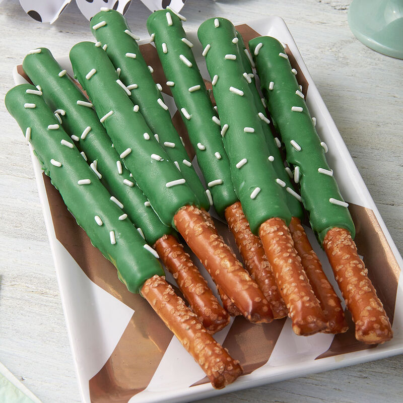 These Cactus Pretzel Rods make a great treat or snack. Made using Dark Green Candy Melts Candy, these sweet and salty snacks are great for those looking for a fast and easy dessert or party favor. Sprinkle dipped pretzels with coconut or sprinkles to create cactus spikes.