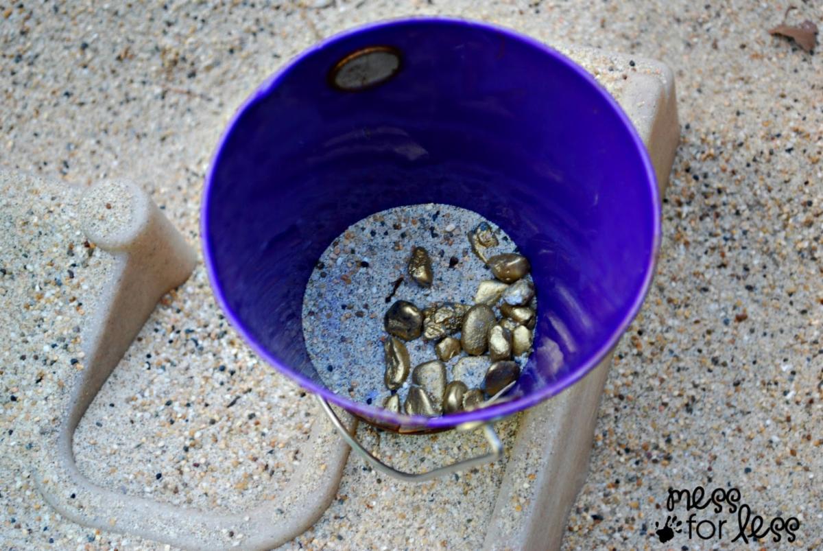 Paint small rocks or pebbles with yellow or gold paint. Add sand and rocks into a water table, pool or bin. Using sifters have children pan for gold. Count how much gold they found!