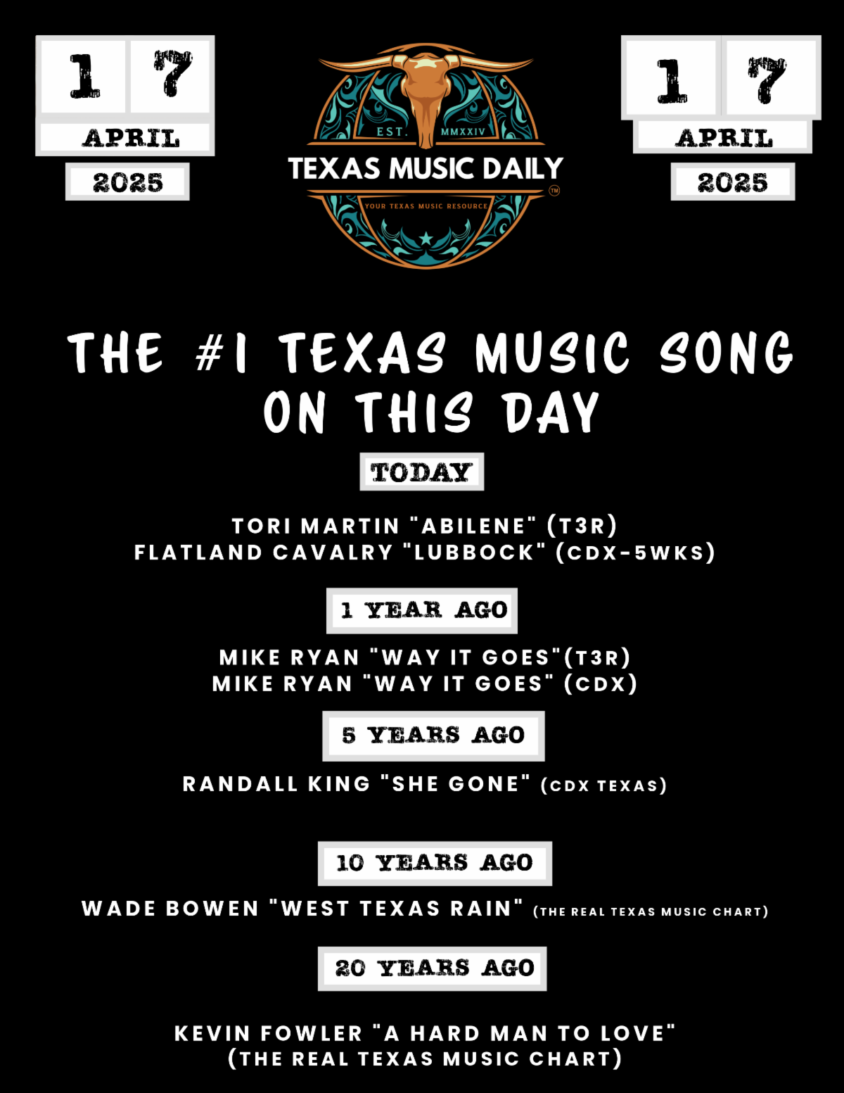 · Tori Martin hits #1 with “Abilene.” TMD 4/17/25.