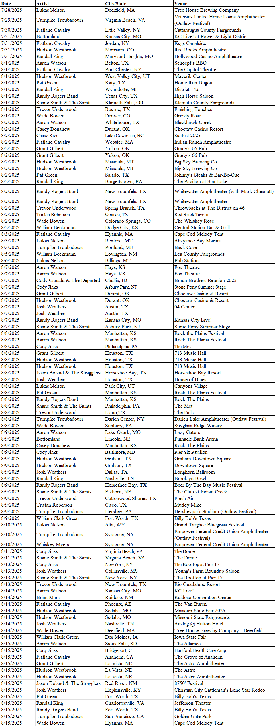 If you would like your tour dates added, please send an email with your dates in an Excel file in the format below to