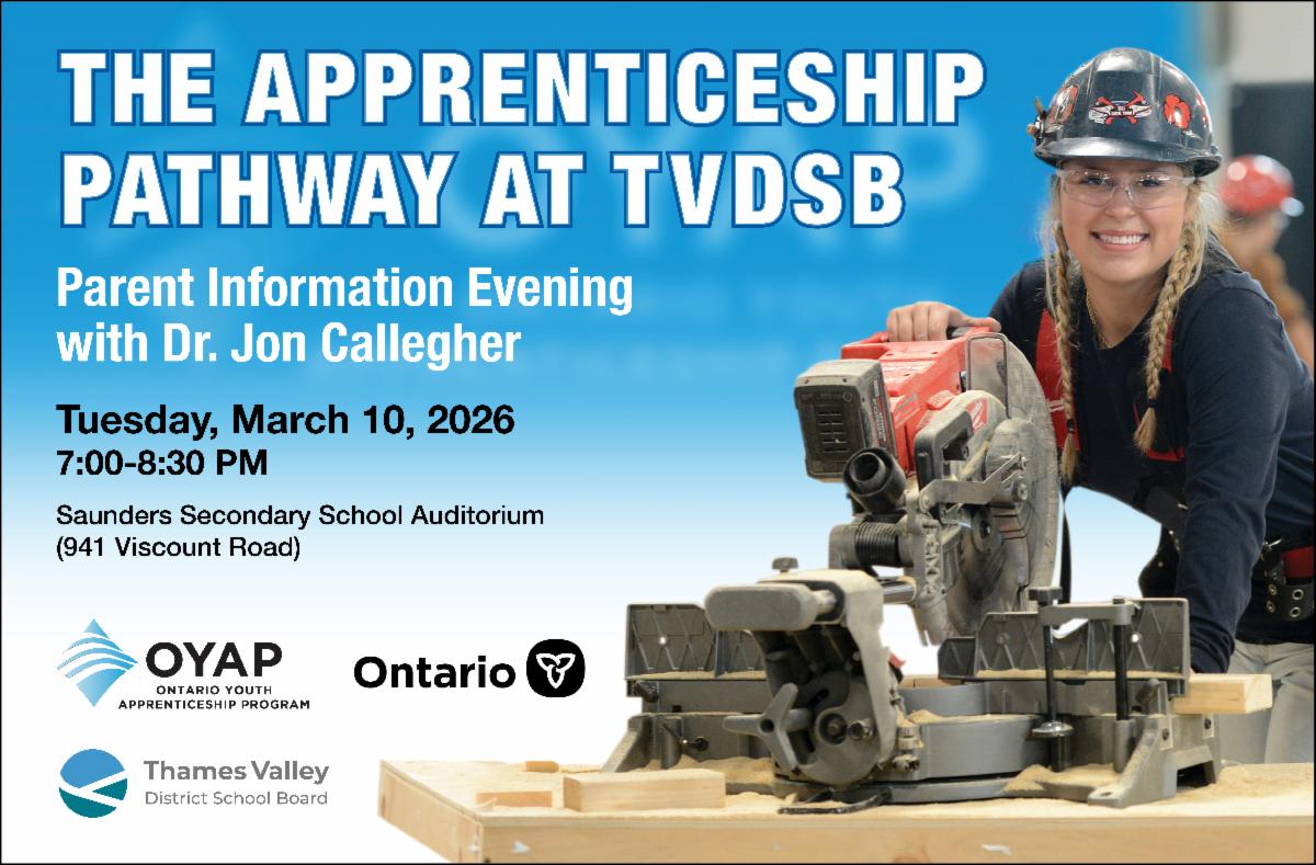 Parents and caregivers are invited to attend The Apprenticeship Pathway at TVDSB: Parent Information Evening with Dr. Jon Callegher on Tuesday, March 10, from 7:00 to 8:30 p.m. at Saunders Secondary School.