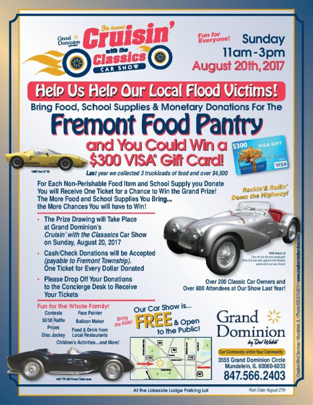 Every year the wonderful volunteers at Grand Dominion, 3555 Grand Dominion Drive, Mundelein, led by Bob Giles, host a car show to benefit the Fremont Township Food Pantry. Mark your calendar for