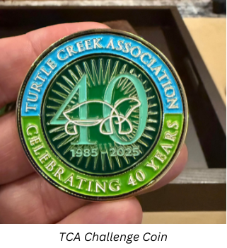 The purpose of the party was to thank our patrons, the heart and soul of TCA. Without their dedication, none of the work we do to preserve and enhance Turtle Creek would be possible. As a token of our gratitude, each guest received a TCA-commissioned Challenge Coin. Challenge coins honor commitment, loyalty, and achievement—making it the perfect symbol of 40 years of stewardship and of each patron’s ongoing dedication to protecting and beautifying the Turtle Creek Corridor.
