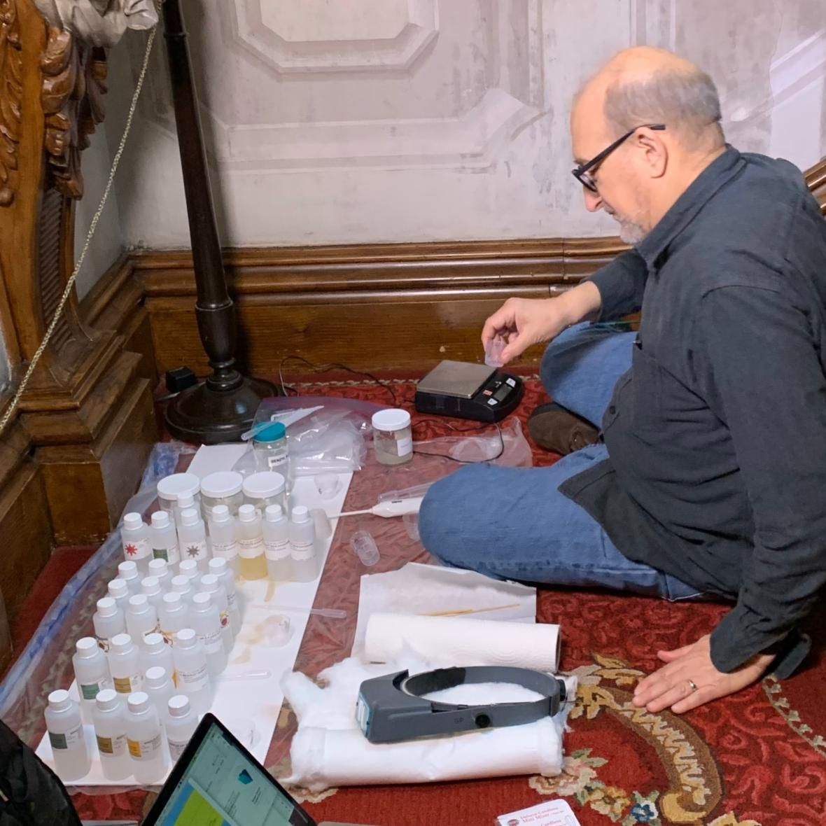 Chris Stavroudis mixes cleaning agents for tests on the Stair Hall landing, November 2023. | | |