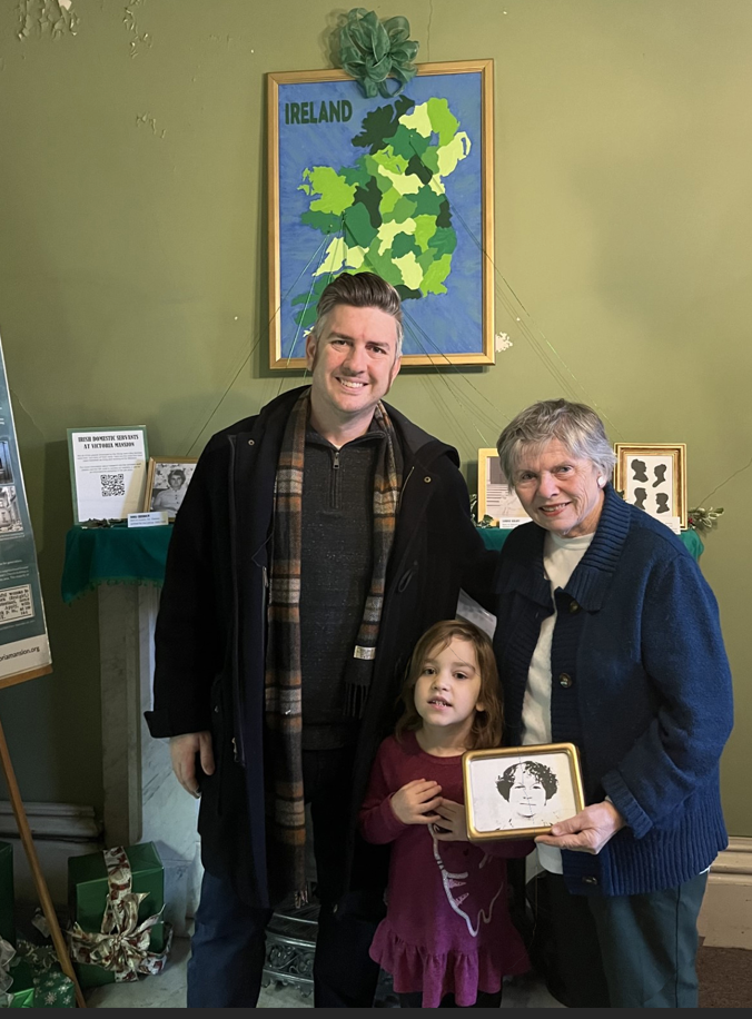 Katherine Cullinane's niece Cathyellen visits Victoria Mansion's Girls Room with her son James and granddaughter Bernadette. Cathyellen is holding a photo of Katherine from her naturalization papers.
