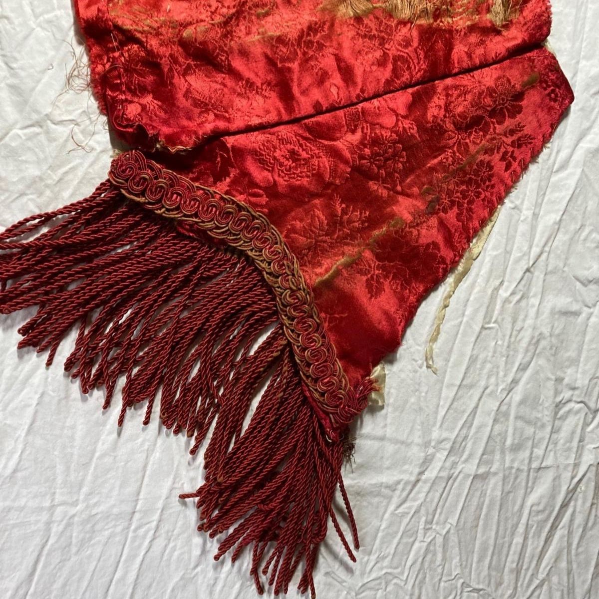 The Red Bedroom has not yet been conserved, and the painted decoration on the walls has likely faded over time. However, the textiles in our collection (possibly from the room's bedcurtains) show the vibrant hues of red that would have adorned the space. | | |