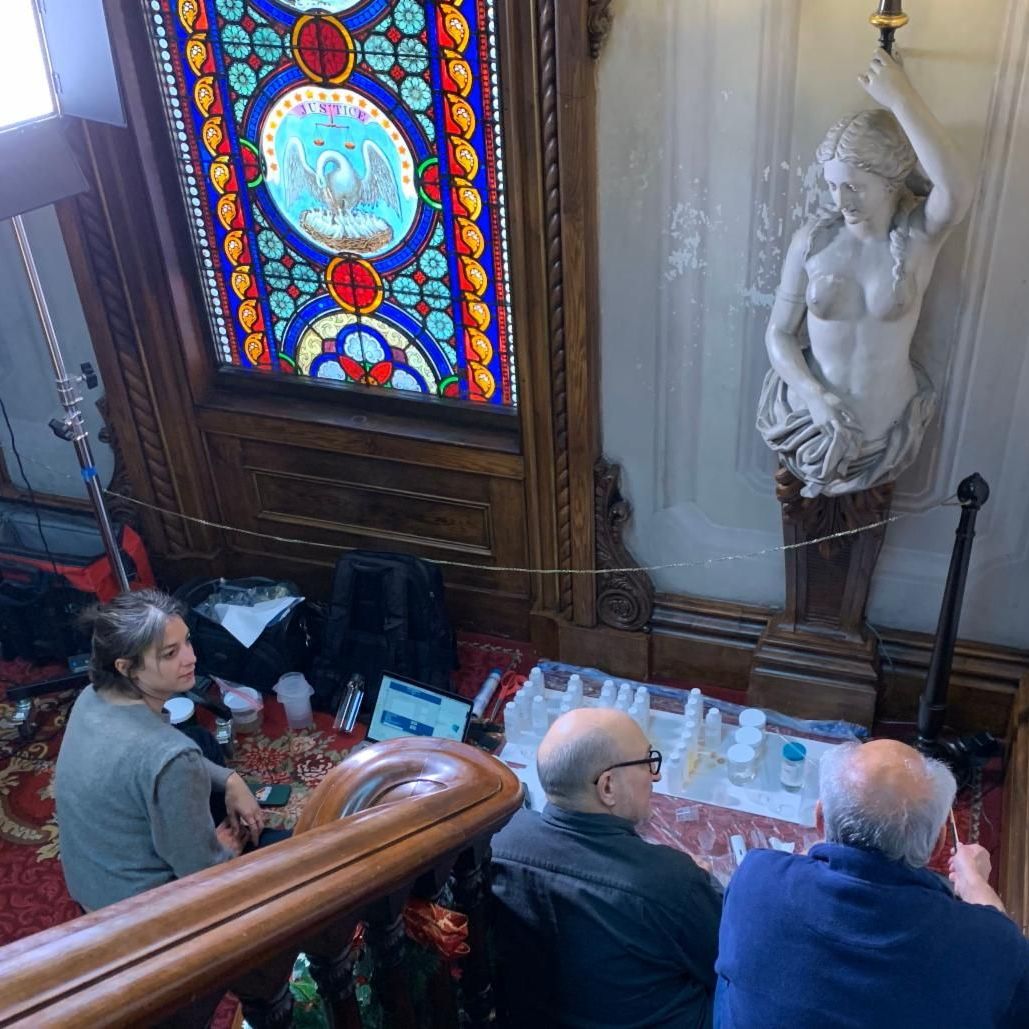 In November, we were pleased to welcome Chris Stavroudis, a nationally respected paintings conservator and conservation science expert, for a consultation to develop a safe and effective cleaning regimen for the painted decoration on the second floor Stair Hall. Conservation of the first floor was ongoing throughout 2023, with the Parlor side of the hall reaching completion by early fall. Working with long-time Mansion collaborators Gianfranco Pocobene Studio, Chris conducted a series of test cleanings on the Stair Hall landing, and made recommendations for how best to proceed with conservation. | |