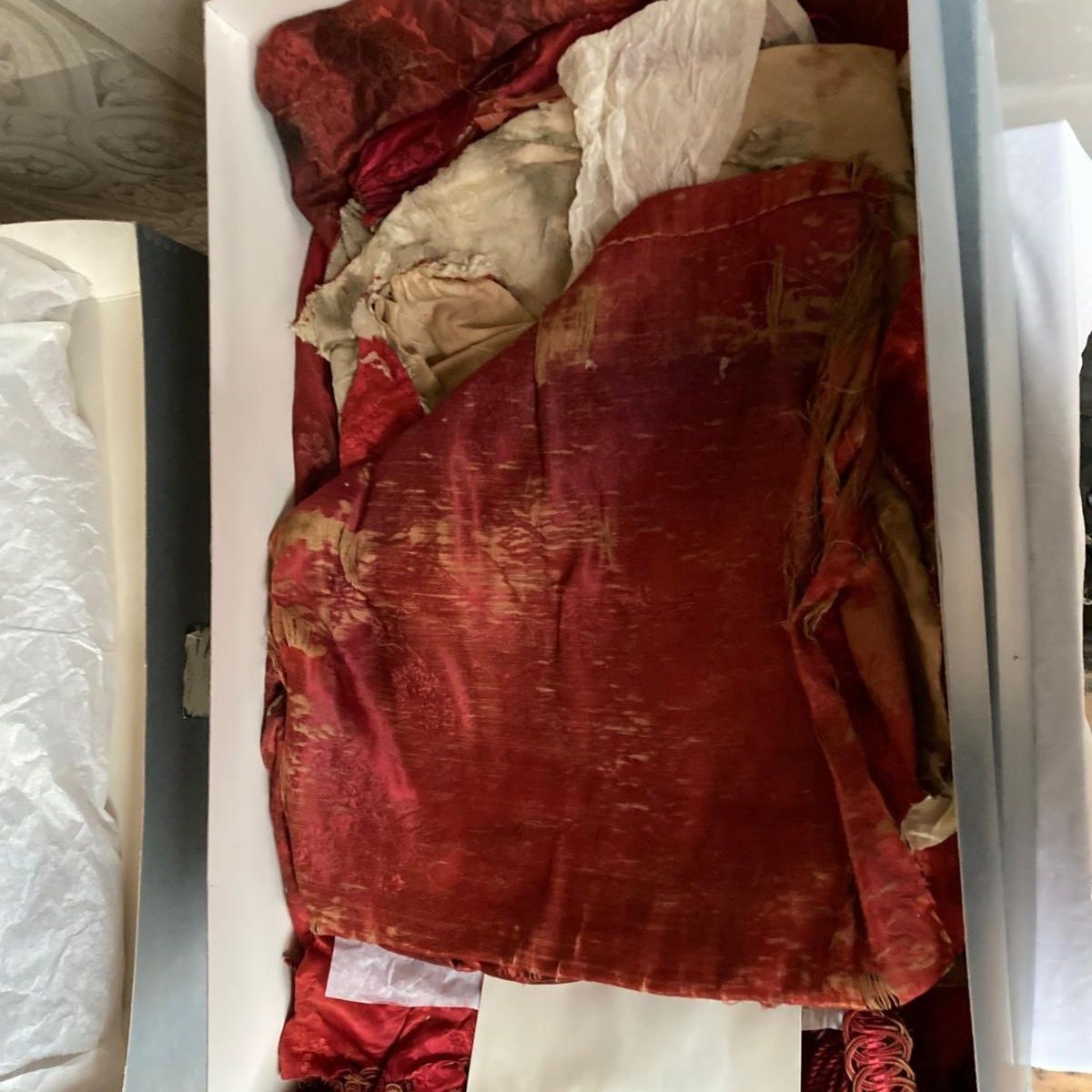 Original textiles from the Red Bedroom, stored in acid-free boxes and awaiting conservation. Once cleaned, the textiles will be carefully housed and stored in our climate-controlled storage room on the third floor. | | |