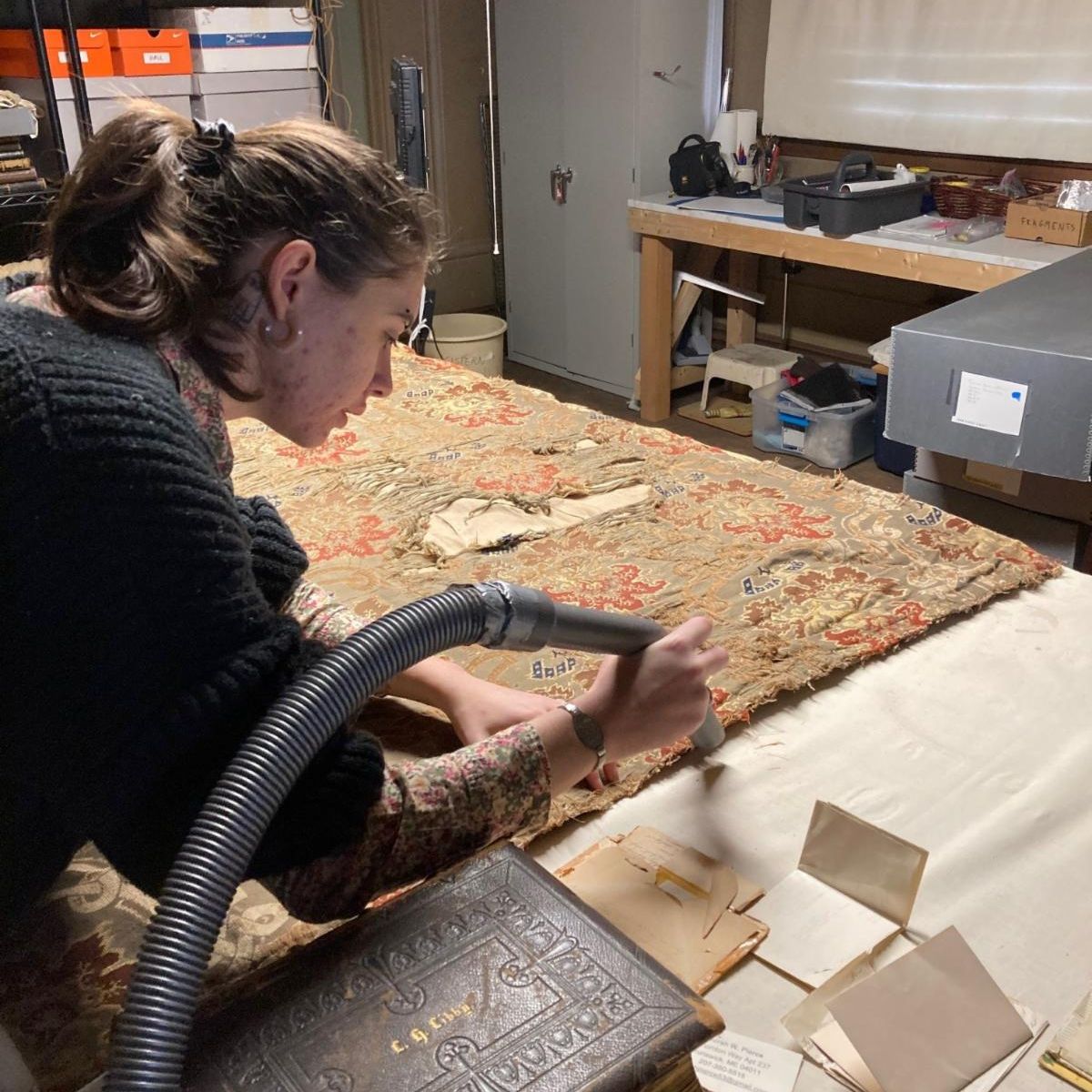 Textile conservation technician Vivian Cunningham has been working with Victoria Mansion conservator Siobhan Lindsay to clean and properly store textiles from the Mansion's original collection. These have ranged from Turkish Smoking Room curtain panels to Red Bedroom textiles to Parlor tassels and beyond. The original trunk room for the Mansion was converted in the 2010s into a climate-controlled textile storage space; Vivian's work will help to keep these textiles in stable condition for future research and reference as we begin to explore options for window treatment restoration in the Reception Room and Parlor. | |