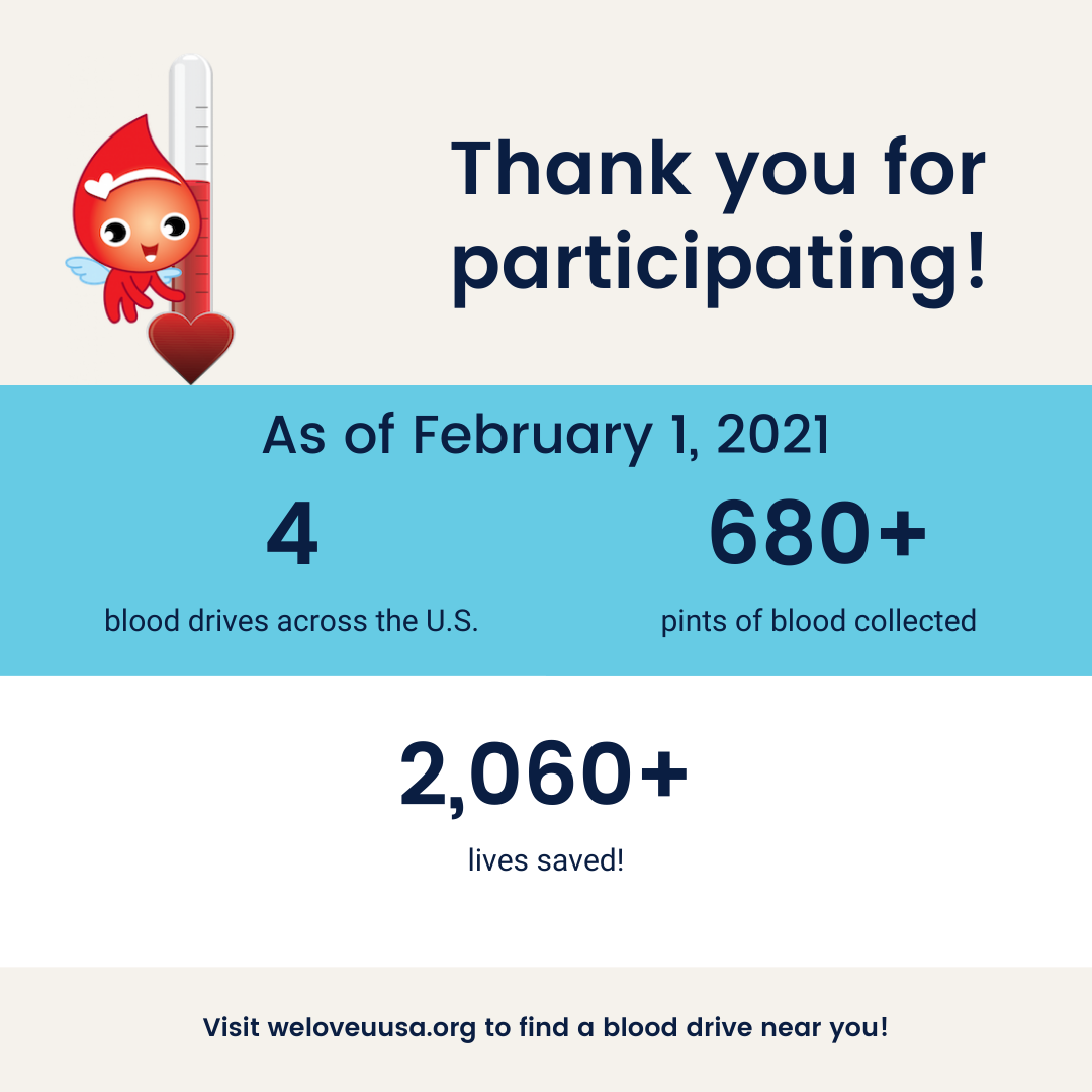 There are more opportunities to donate with WeLoveU throughout February. Join the national effort to raise awareness and donate at a blood drive near you!