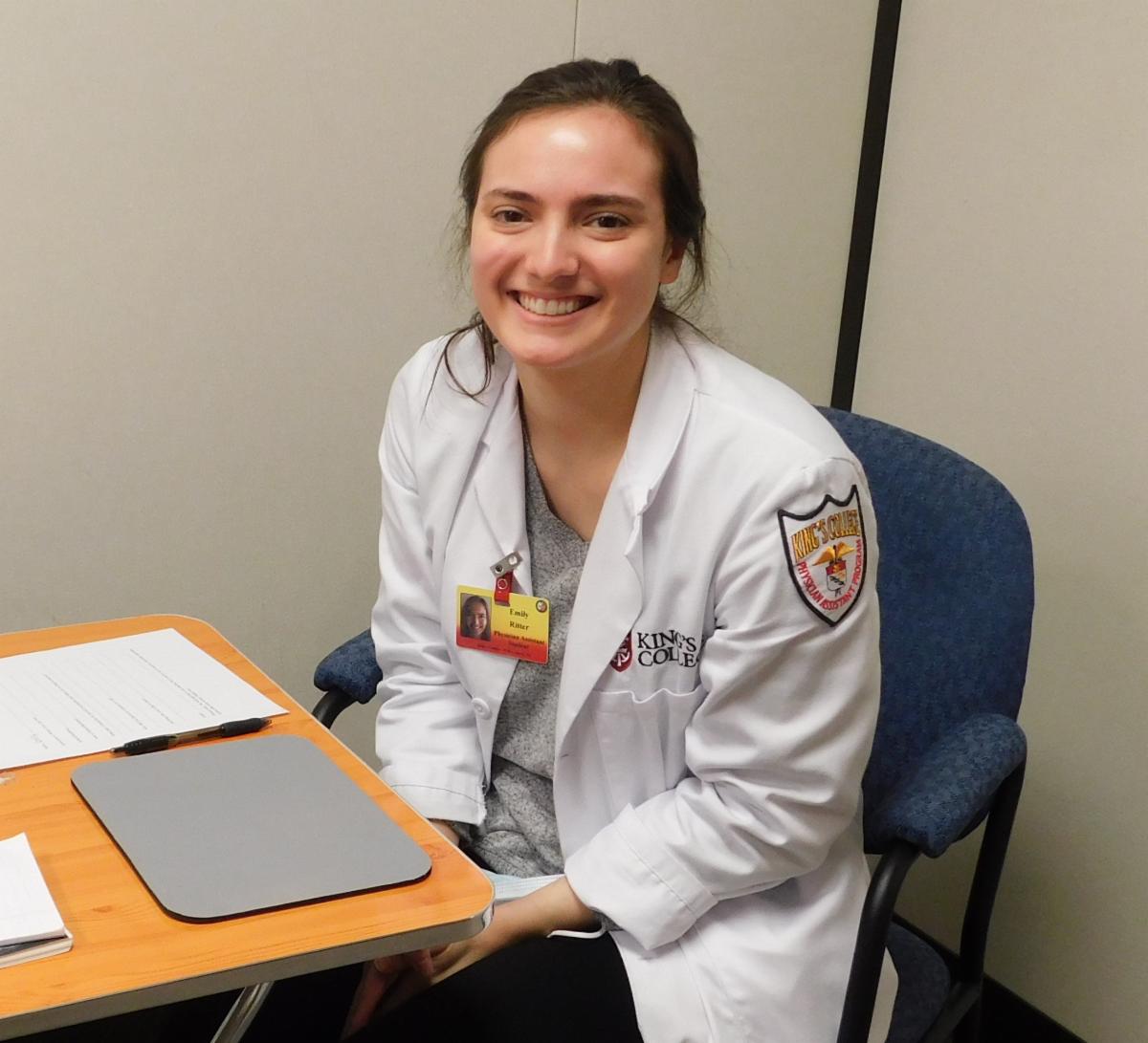 Emily Ritter is from Hanover, PA, (near Gettysburg) and in her 5th year of the Physician Assistant program at King's College. She is considering primary care positions after graduating but also enjoys orthopedics. She finds providing care to underserved populations as very worthwhile. Emily is also bilingual which is helpful with the Spanish speaking patients.