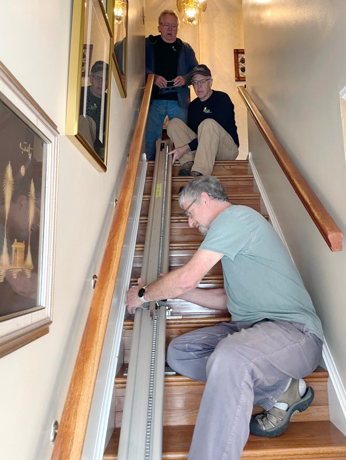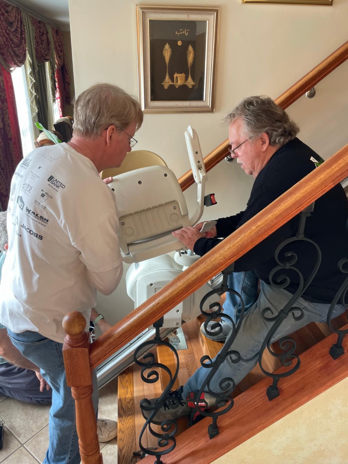 This installation was led by two of our dedicated volunteers, Lou Wood and David Throckmorton. Their expertise and care are remarkable on their own, but what makes their involvement truly special is their commitment to training others. As they complete each installation, they are also teaching additional volunteers how to install and maintain stairlifts—expanding the capacity of this life-changing program for homeowners.