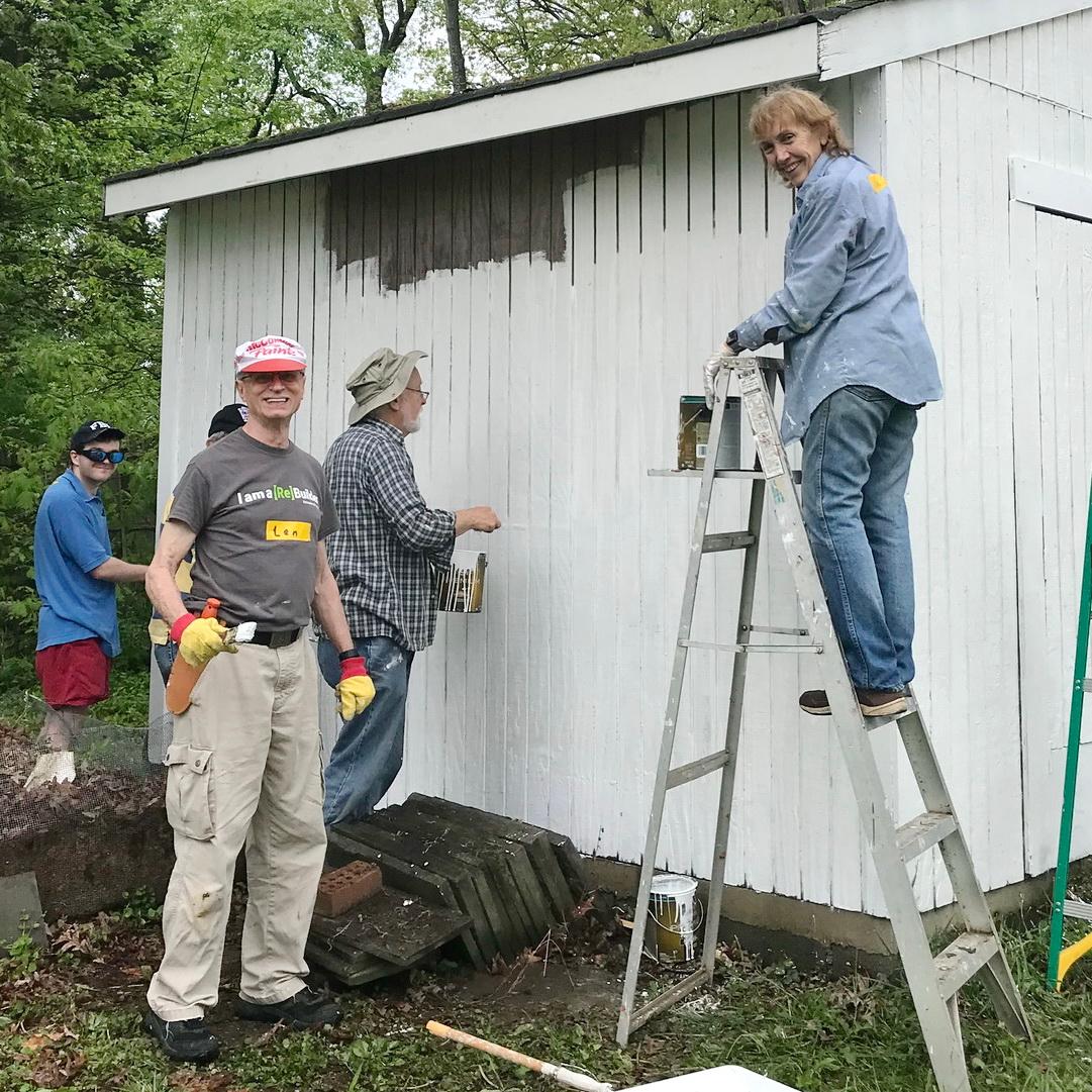 At the home of a retired mechanic and small business owner, ACCA volunteers painted a large shed, repaired foundation mortar, replaced window trim, installed a new toilet, and completed other repairs. The team included volunteers from St. Barnabas’ Episcopal and Annandale United Methodist churches. Lunch was provided by Lincolnia United Methodist Women. (team photo at right and second line of photos below)