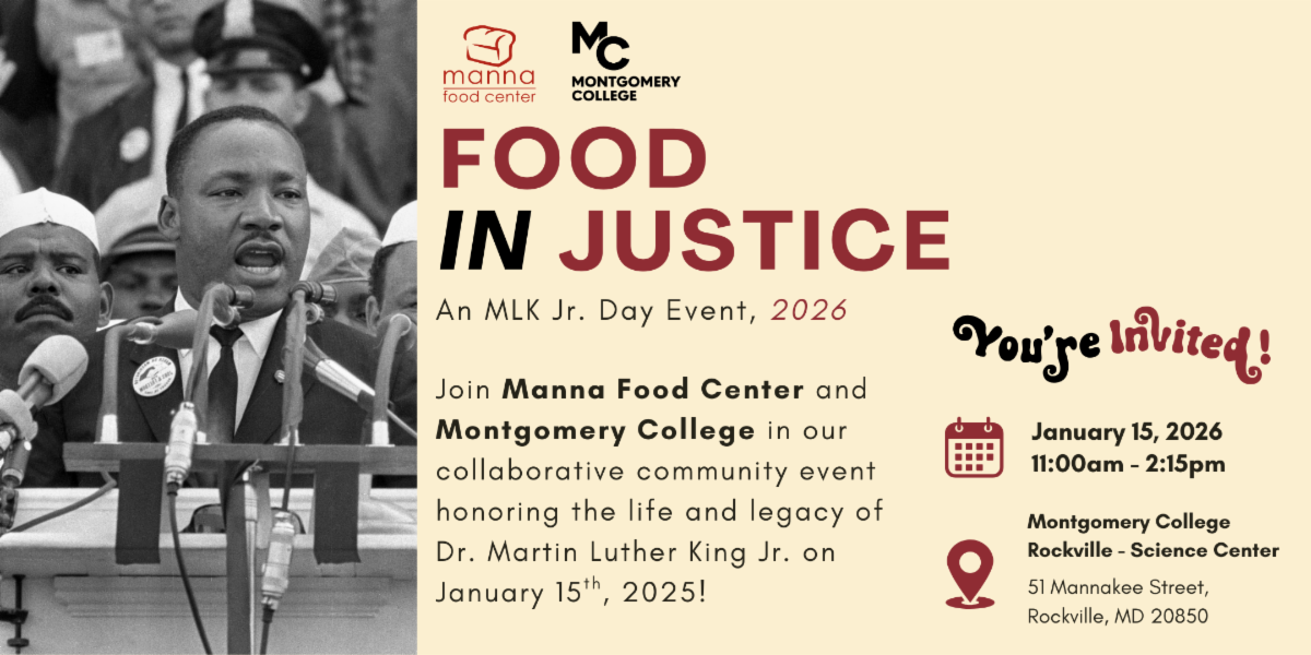 Join us at Manna Food Center's annual MLK Jr. Day event to recenter today’s food justice struggles in relation to Martin Luther King Jr.’s life and legacy. This collaborative event will bring together community members, organizations, and local businesses that are critical parts of our food system to discuss pathways towards a more food secure and more just Montgomery County.