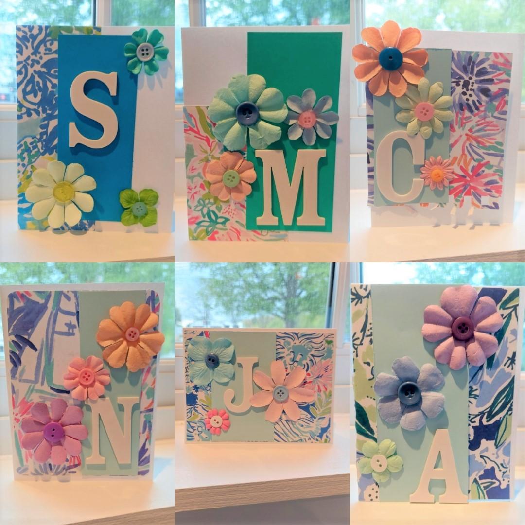 A beautiful array of monogrammed greeting cards created by repurposing bright, floral pages from a 2020 Lilly Pulitzer planner. Gorgeous!