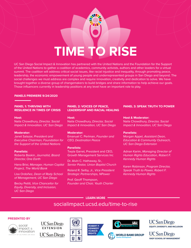 UC San Diego Social Impact & Innovation has partnered with the Foundation for the Support of the United Nations (FSUN) to gather a coalition of academics, community activists, authors and other leaders for a virtual summit. The coalition will address critical social issues, like racial injustice and inequality, through promoting peace, leadership, the economic empowerment of young people and underrepresented groups in San Diego and beyond.