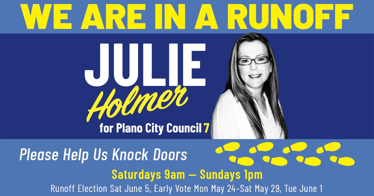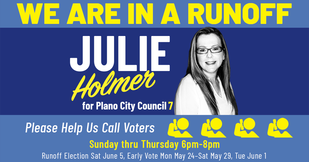 We need to connect with the community and let them know about the June 5 runoff election. You can help by calling Plano voters, finding out what they need, and letting them know about the service Julie Holmer has been giving back to our city for her entire life.