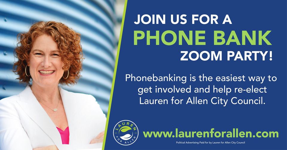 Join us as we call Allen voters to get the word out about re-electing Lauren for Allen City Council! This will be a recurring event every week so please sign up for any days you are available. We will gather via Zoom and have a short instructional session before we start calling. Thank you for volunteering!
