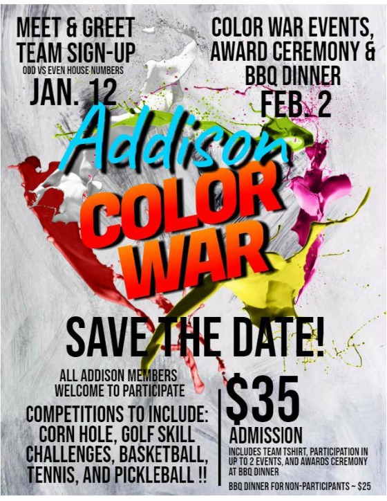 Wednesday is Pickleball competition! Addison Reserve plays vs. other country clubs, from 3 PM to 4:30 PM in what is designed as friendly competition. Sometimes the games will be hosted by Addison and other times in other local clubs.