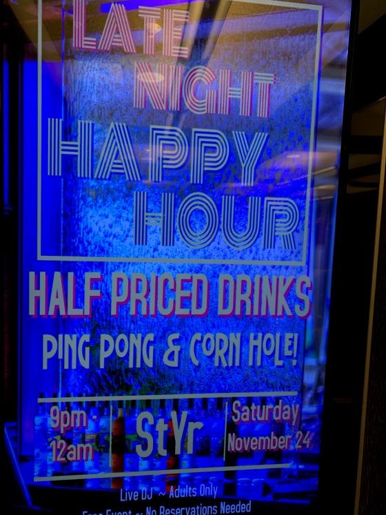 Our next Happy Hour will not be celebrated this Friday at Styr, which is our usual custom, instead it is being changed to November 16th at The Bistro. We look forward to seeing everybody at Styr this Friday anyway and also on November 16th.