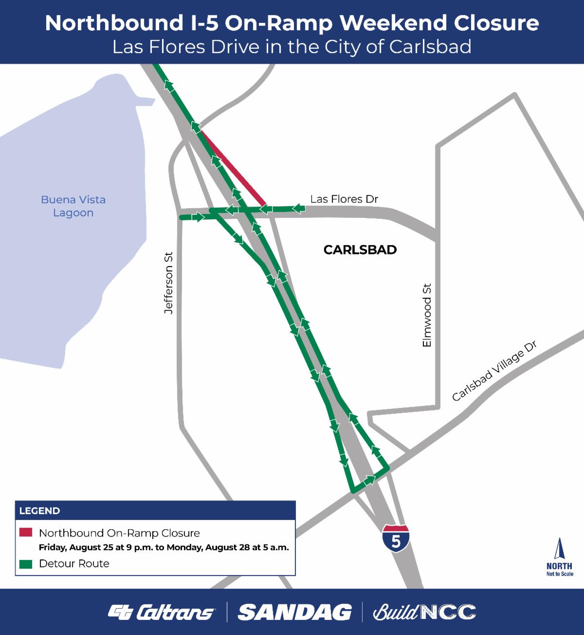 The closure of the northbound Las Flores on-ramp will begin Friday, August 25 at 9 p.m. and it will be reopened at 5 a.m. on Monday, August 28. Motorists can detour using southbound I-5 to Carlsbad Village Drive and then enter northbound I-5. This closure will allow crews to safely reconfigure the on-ramp within one weekend, rather than imposing closures over a period of months.