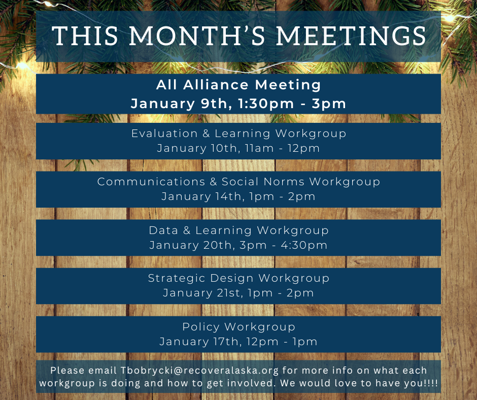 We’re thrilled to invite you to the Alliance Dinner, a centerpiece of our upcoming All Alliance Gathering in Juneau. This special event will take place on Tuesday, March 4th, at 6:00 PM at The Hangar at the Wharf. This dinner is a unique opportunity to connect with prevention advocates, workgroup leads, co-chairs, and other Alliance members from across Alaska. If you haven’t RSVP’d yet, please email me to reserve your spot.