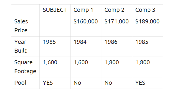 Looking at the grid below you would expect the subject to have more value than comp 1 but less than comp 3. You can subtract the sales price of comp 1 from comp 2 to determine a