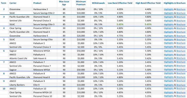 MYGA Rate Guides: Low Band Rate / $100.000 Rates / $250,000 Rates