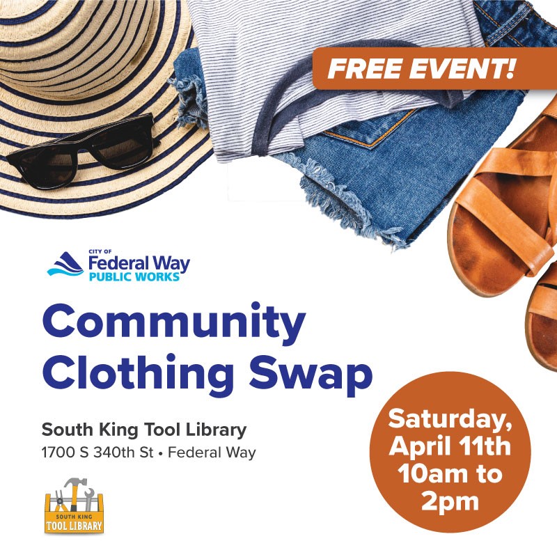 Join us for a free community clothing swap on Saturday, April 11, at the South King Tool Library from 10 a.m. to 2 p.m.