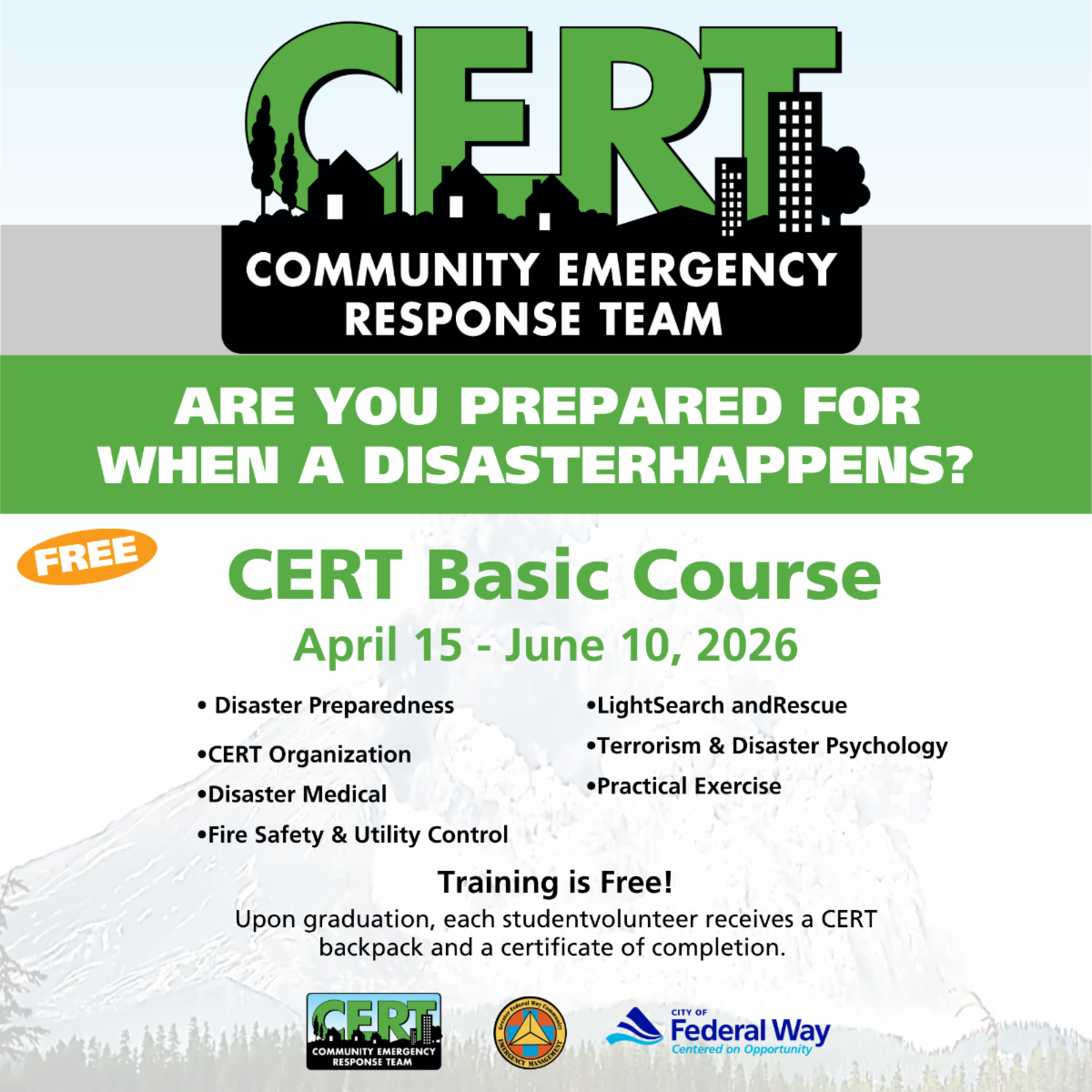 Join our Spring 2026 CERT Basic Course to develop new skills to protect yourself, your family, and your neighbors in the event of a disaster.