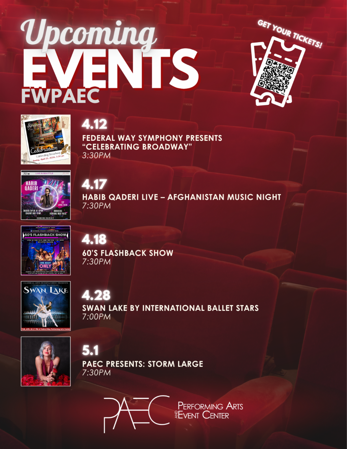 The Federal Way Performing Arts & Event Center (PAEC) puts on a wide variety of events year-round. Upcoming events include: