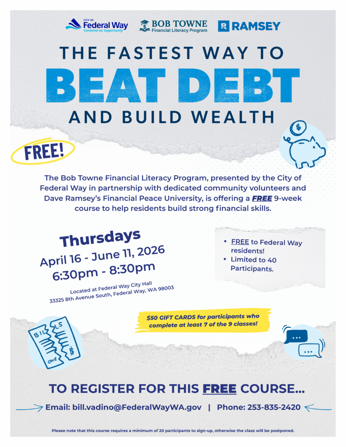 The Bob Towne Financial Literacy Program, presented by the City of Federal Way with help from community volunteers and Dave Ramsey’s Financial Peace University, is offering a free nine-week course focused on budgeting, getting out of debt, saving, and building financial confidence.