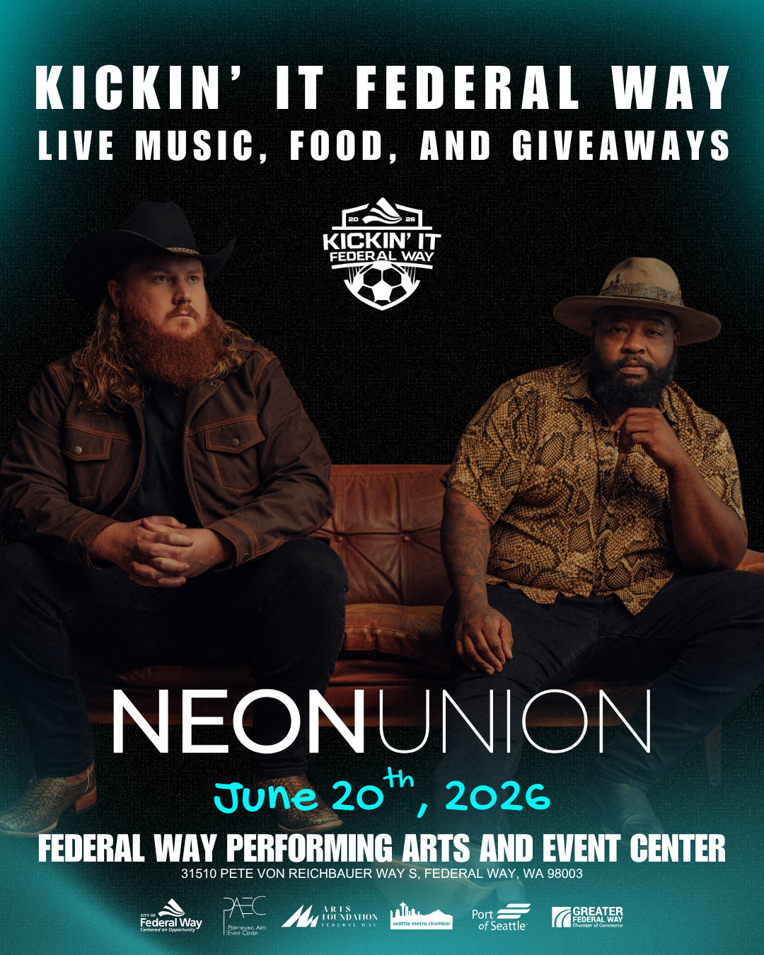 Enjoy their country hits along and the rest of the Kickin' It Federal Way lineup, which will include FIFA World Cup 26™ watch parties, live performances on the outdoor stage, food truck alley, and a wide range of family-friendly activities.