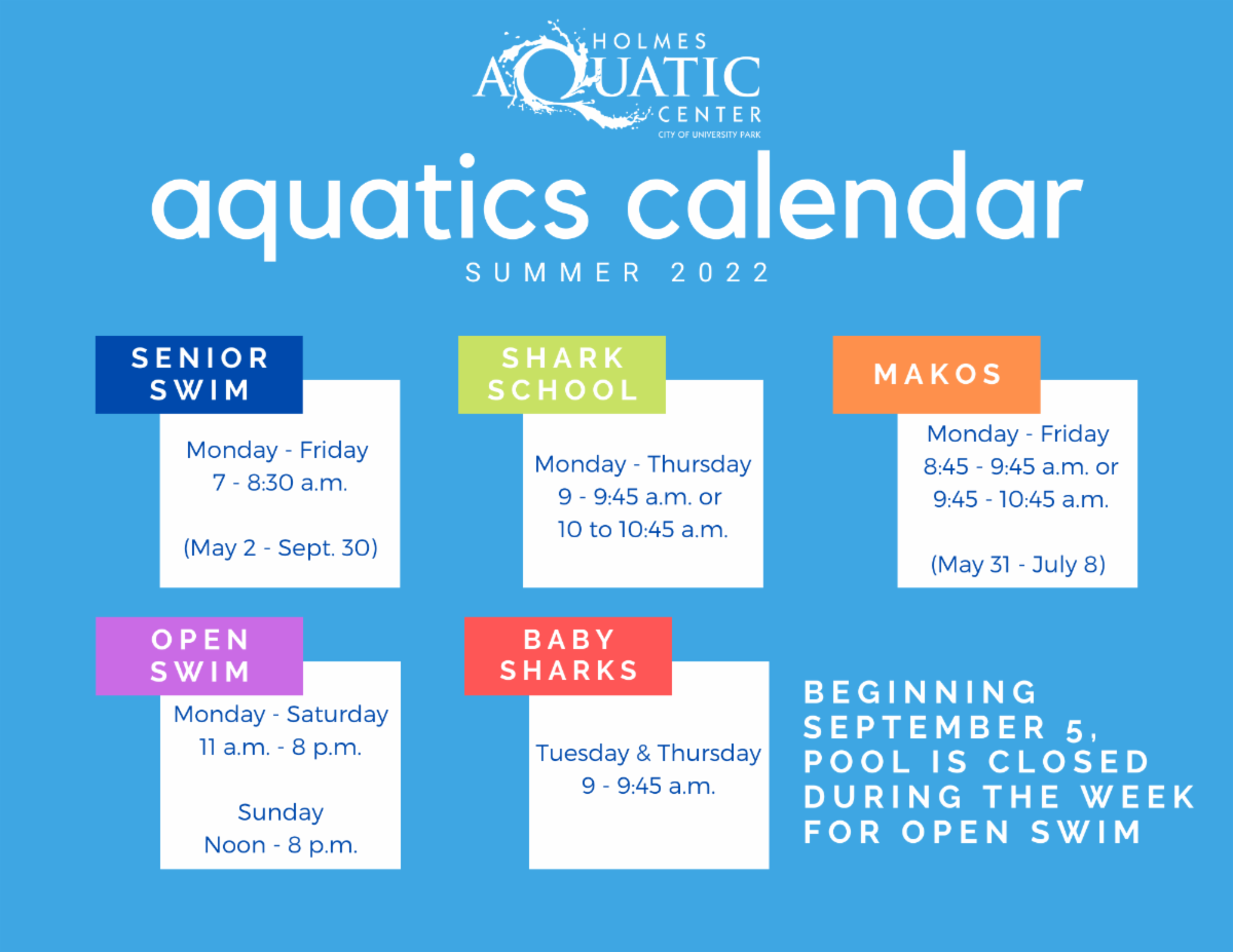 Pool passes can be purchased in-person at the Holmes Aquatic Center or online using an existing RecTrac account.