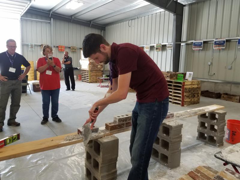 Nolan Stevens learning the basics of brick laying. He also learned installation of stone veneer.