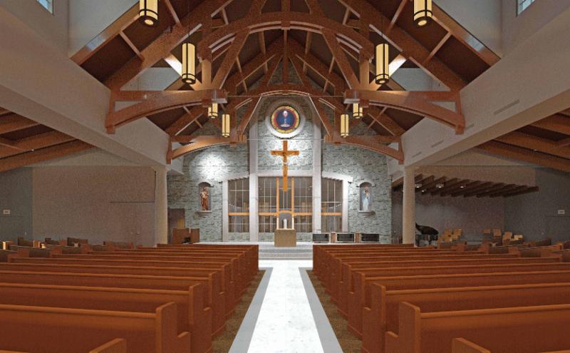 will accommodate approximately 700 parishioners. The Main Level is 17,540 s.f. and includes a Choir Area, Family Room, Sacristy, (2) Reconciliation Rooms, and a 30 seat Chapel. The Lower Level will house a Full Kitchen, Fellowship Hall, and Parish Offices. The Church has a traditional feel with the glu-lam structure and exposed tongue & groove wood roof deck. Together with Mark Lambrecht, owner of Lambrecht Glass Studio, Inc., St. Matthew’s is working on designs for future stained glass windows. The construction documents for this beautif
