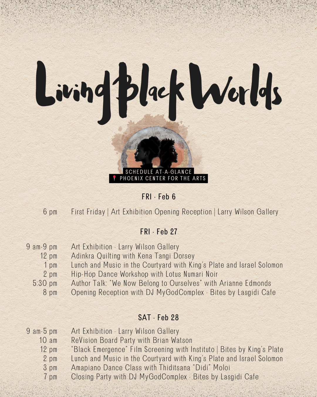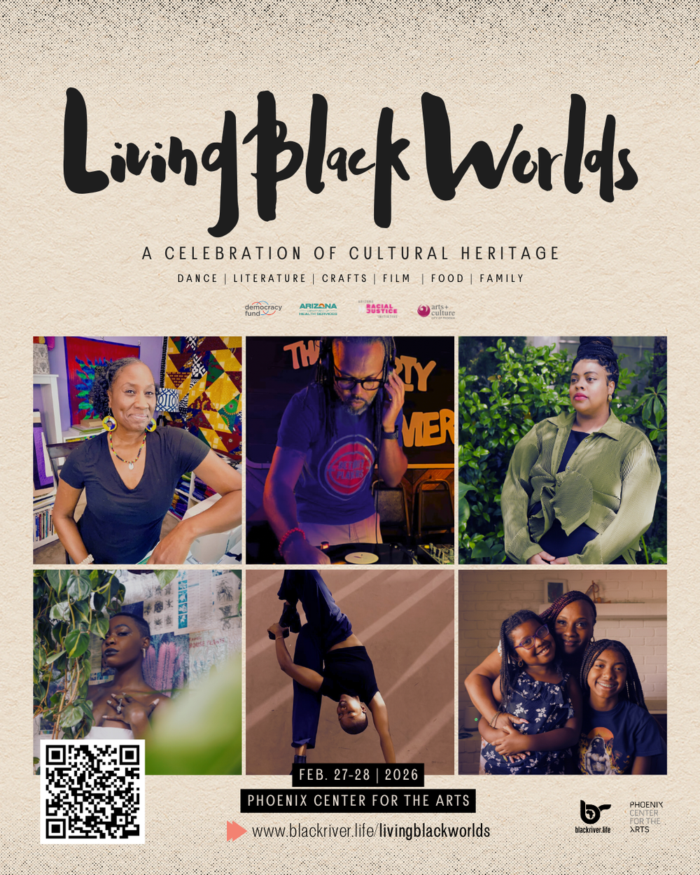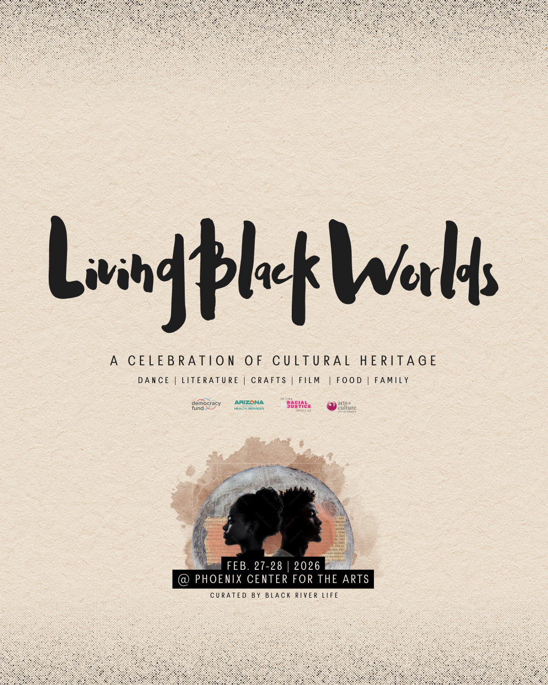 At Phoenix Center for the Arts, we believe arts and culture are essential tools for learning, connection, and cultural exchange. This Black History Month, we invite you to experience Living Black Worlds—a two‑day immersive cultural activation curated by Black River Life that centers Black creativity as something living, evolving, and shared.