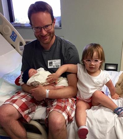 Nate Spang holds son Liam while sister Alice meets her baby brother for the first time.