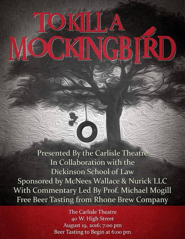 The Carlisle Theatre and the Dickinson School of Law are hosting the event. On August 19 at 7:00 PM we are showing the film To Kill A Mockingbird. The film will be followed by a panel discussion led by Professor Michael Mogill. One panelist will be Jon Birbeck, who is currently the Chief Deputy District Attorney for Cumberland County, but who has been tapped by Governor Wolf to take over the Cumberland County Magisterial District Court.