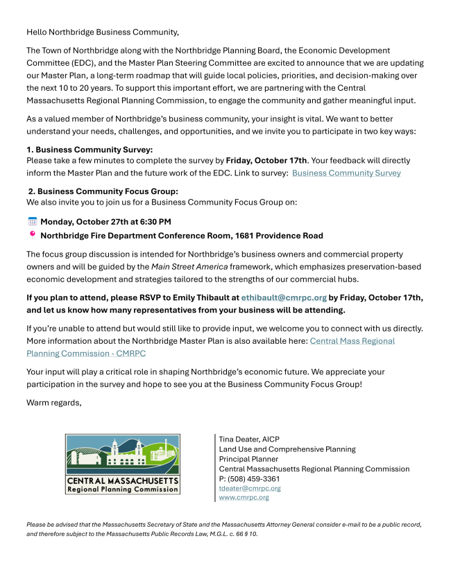 The Town of Northbridge along with the Northbridge Planning Board, the Economic Development Committee (EDC), and the Master Plan Steering Committee are excited to announce that we are updating our Master Plan, a long-term roadmap that will guide local policies, priorities, and decision-making over the next 10 to 20 years. To support this important effort, we are partnering with the Central Massachusetts Regional Planning Commission, to engage the community and gather meaningful input.