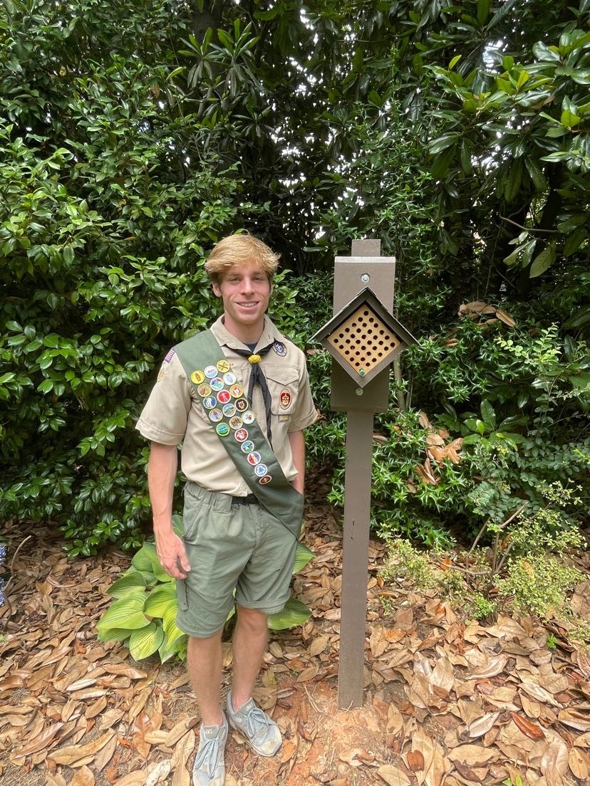 "There is a new addition to our Memorial Garden. Bee Hotels! My name is Ellis Sheridan. I am a rising high school senior in our congregation as well as an active member of Boy Scout Troop 38. For my Eagle Scout project, Providing for Pollinators, I wanted to protect and promote the well-being of our native bee species through structures known as bee hotels. The location chosen, the Memorial Garden, is a perfect spot to support our pollinators.